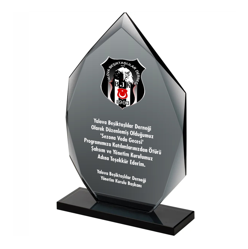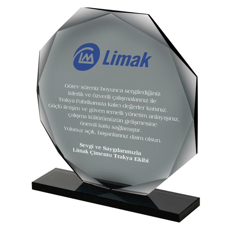 PLAKET BOYUTLARI BASKI ŞEKLİ Altıgen Füme Kristal Plaket : 11cm x 20cm x 1cm dir. Baskı Şekli uv baskıdır. Kadife Kutulu kutusuz seçenekler