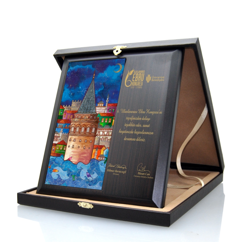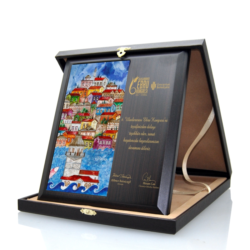ÇİNİLİ PLAKET BASKI ŞEKLİ MALZEMESİ Çinili plaket; deri kutulu maun boyalı kabartma çini desenli lazer kazımalı olarak yap